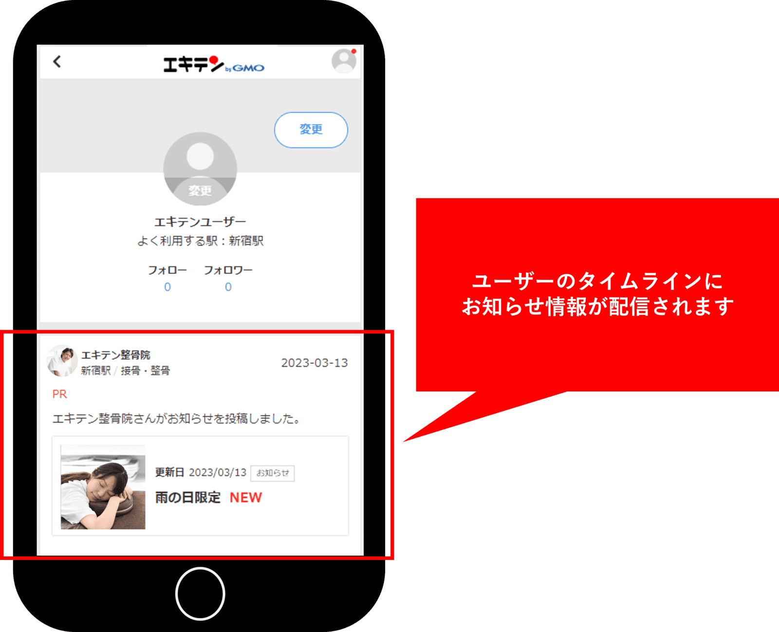 エキテン会員のタイムラインにお店のお知らせを配信できます。お店の最寄り駅近くを生活圏としているお客様にお知らせが届くので、集客効果が期待できます。